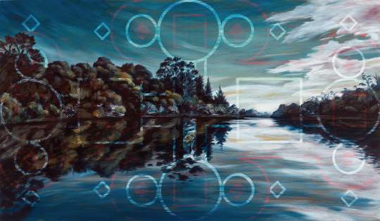 This painting is currently on display at 5th Avenue Family Practice along with some other spectacular local art. This work was an option for a commission painting I’m working on. I kayaked out the Wairoa river mouth into Tauranga Harbour and took a heap of photos. It has a weird geometric structure loosely based on illuminated manuscript page designs.